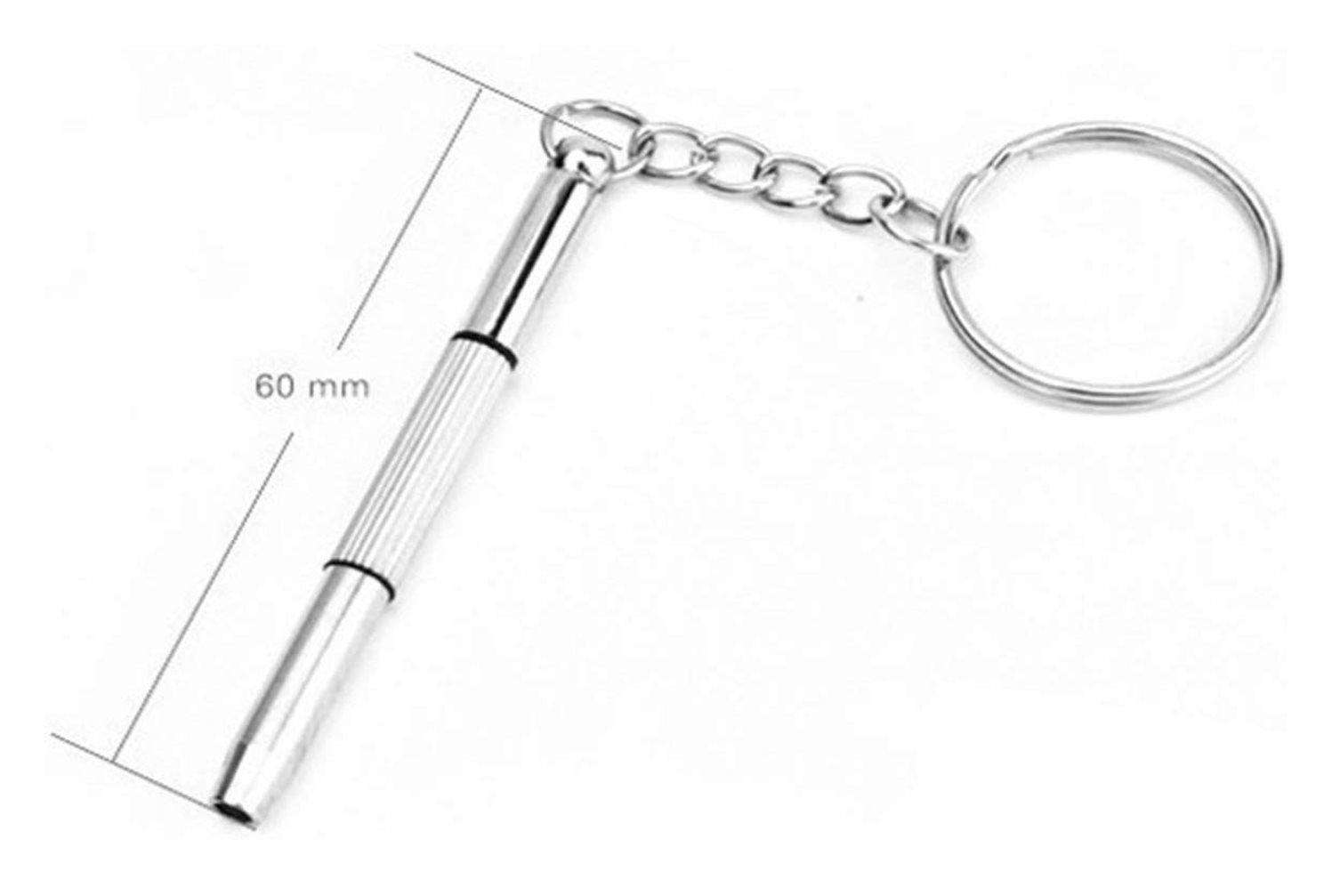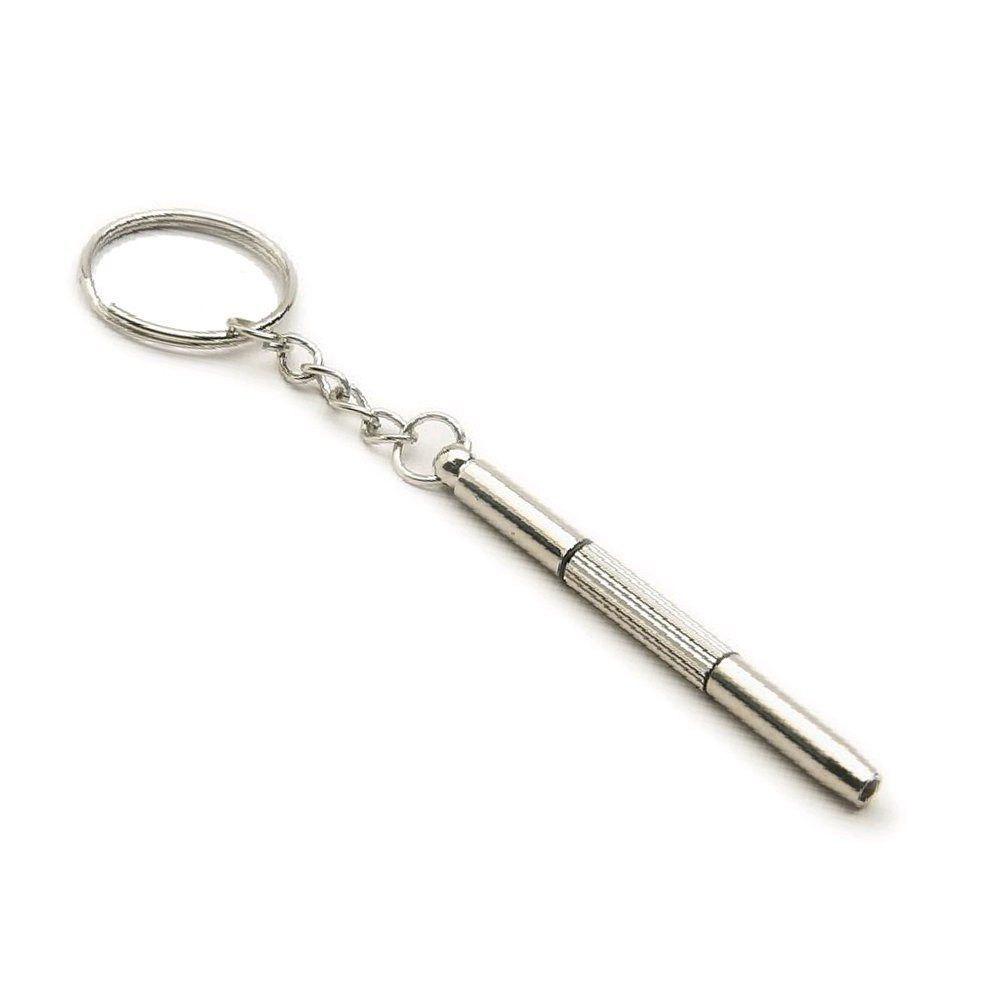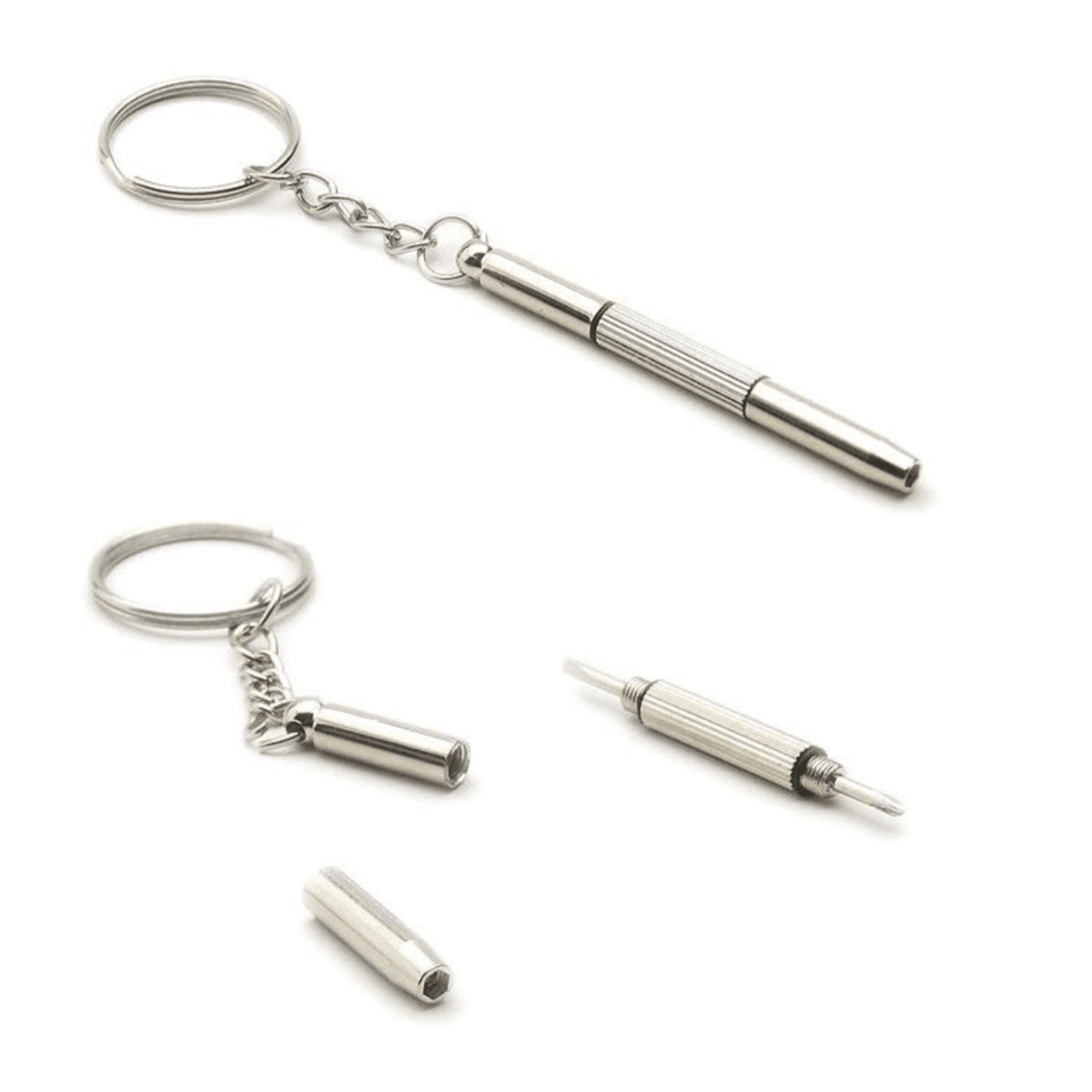 Mini 3 in 1 Stainless Steel Nut/Screwdriver Keychain Precision Eyeglass and more Repair Tool. This unique tool will work to repair or tighten up screws on virtually all eyeglasses, sunglasses, watches and moble devices, plus more. Keep it readily available with you at all times with the key ring that will attach directly to your personal set of keys.